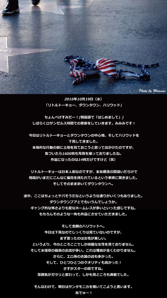 ※こちらは2016年に運営していたサイト『A Magazine of Melody Clocks』で連載したブログから移植した内容となります。 10月18日〜11月16日みみみ ロサンゼルス武者修行編写真撮影、路上パフォーマンスをメインに現地にて単身活動! そうです。「ある地方」... -