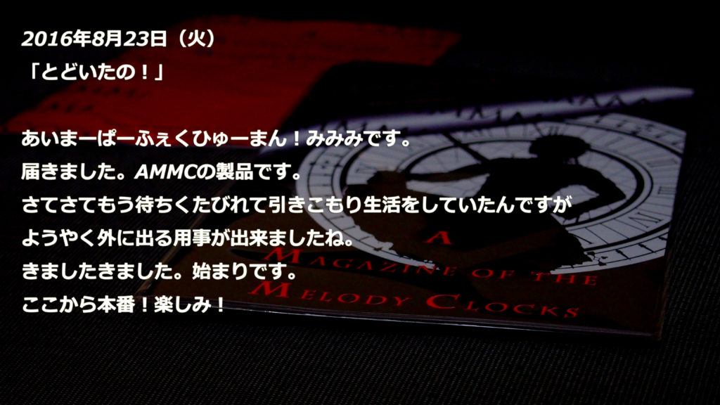 ※こちらは2016年に運営していたサイト『A Magazine of Melody Clocks』で連載したブログから移植した内容となります。 あいまーぱーふえくひゅーまん!みみみです。 届きました。AMMCの製品です。 さてさてもう待ちくたびれて引きこもり生活をしていたんで... -
