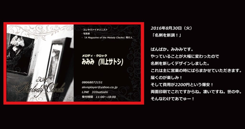 ※こちらは2016年に運営していたサイト『A Magazine of Melody Clocks』で連載したブログから移植した内容となります。 ぱんぱか。みみみです。 やっていることが大幅に変わったので名刺を新しくデザインしました。 これは主に営業の時にばらまかせていただ... -